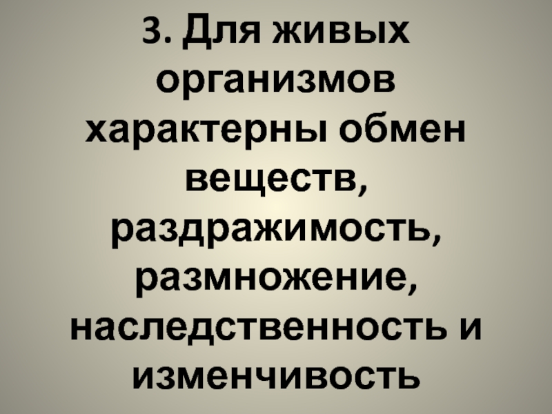 3. Для живых организмов характерны обмен веществ, раздражимость, размножение, наследственность и изменчивость