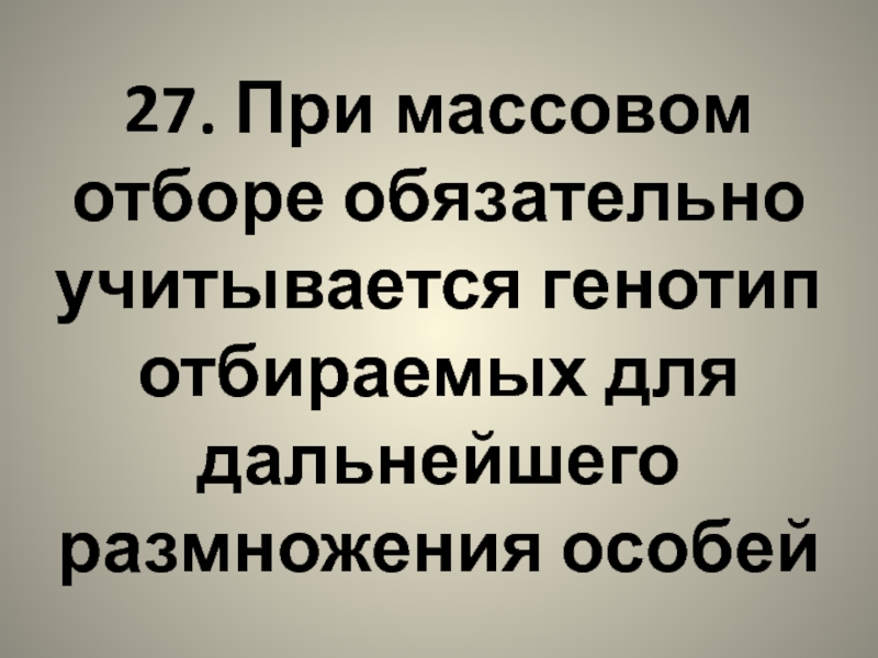 Слайд 2927. При массовом отборе обязательно учитывается генотип отбираемых для дальнейшего размножения
