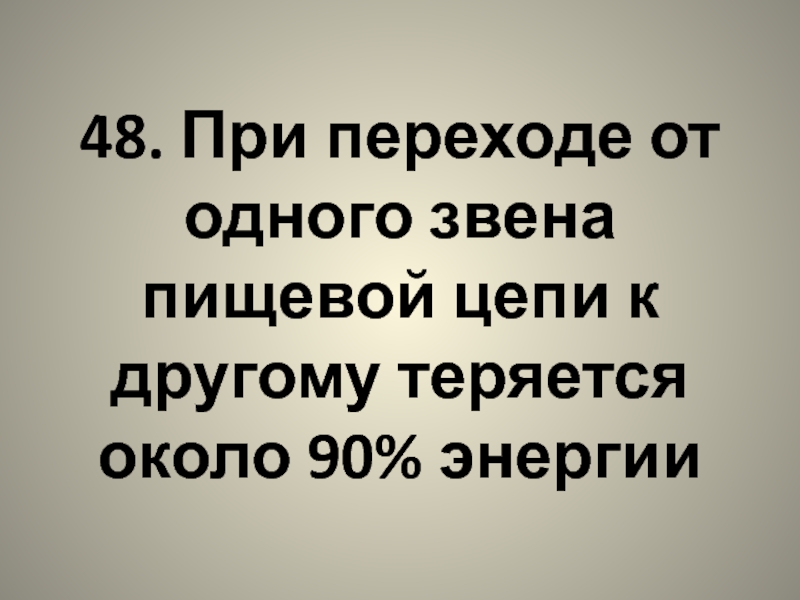 48. При переходе от одного звена пищевой цепи к другому теряется около 90% энергии