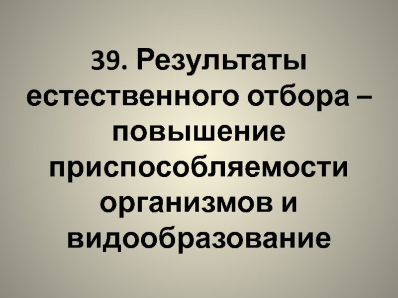 Слайд 4139. Результаты естественного отбора – повышение приспособляемости организмов и видообразование