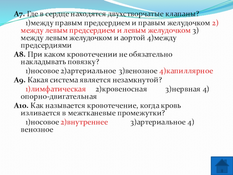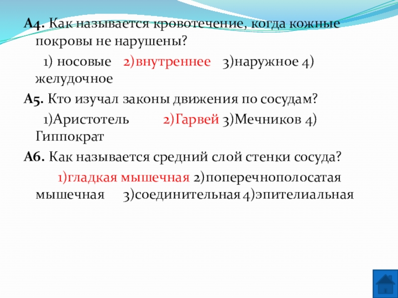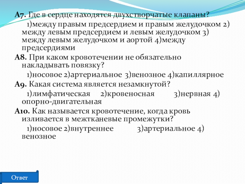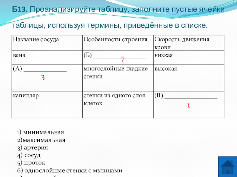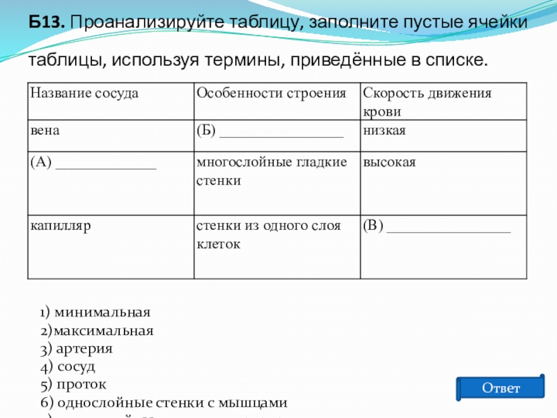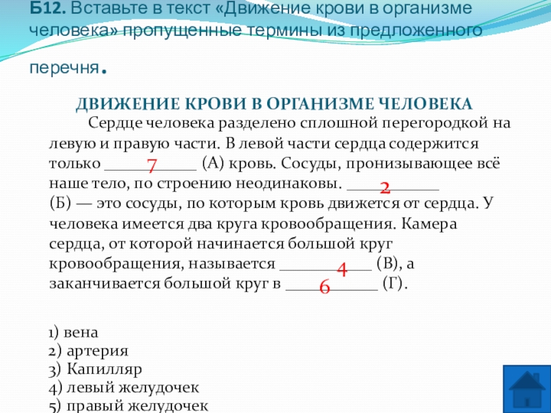 Сердце человека разделено сплошной перегородкой на левую и правую части. В левой части сердца содержится только ___________ (А) кровь. Сосуды, пронизывающее всё наше тело, по строению неодинаковы. ___________ (Б) — это сосуды, по которым кровь движется от сердца. У человека имеется два круга кровообращения. Камера сердца, от которой начинается большой круг кровообращения, называется ___________ (В), а заканчивается большой круг в ___________ (Г).