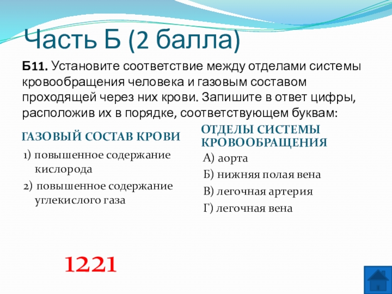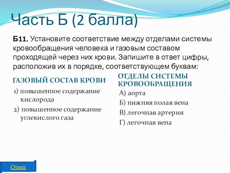 Б11. Установите соответствие между отделами системы кровообращения человека и газовым составом проходящей через них крови. Запишите в ответ цифры, расположив их в порядке, соответствующем буквам: