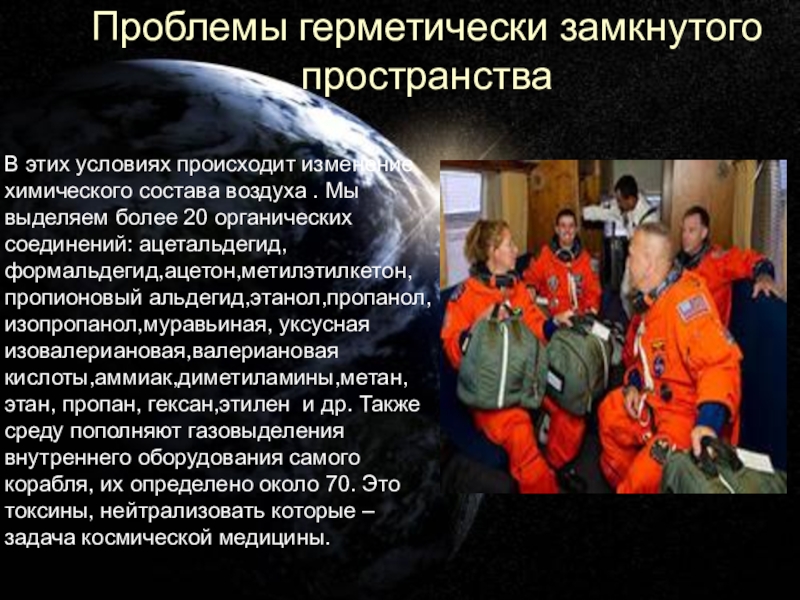 Проблемы герметически замкнутого пространстваВ этих условиях происходит изменение химического состава воздуха . Мы выделяем более 20 органических