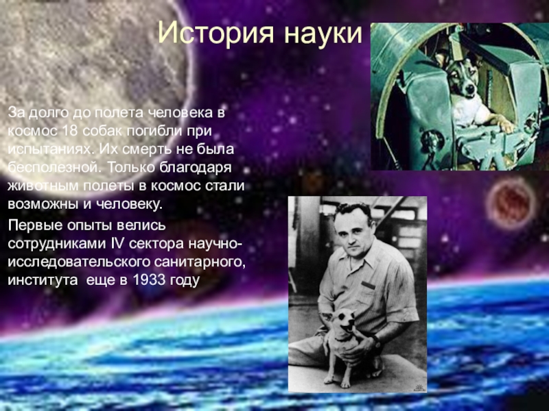 История наукиЗа долго до полета человека в космос 18 собак погибли при испытаниях. Их смерть не была бесполезной. Только благодаря животным полеты в космос стали возможны и человеку.Первые опыты велись сотрудниками IV сектора научно-исследовательского санитарного, института