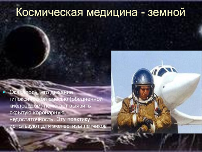 Космическая медицина - земнойНевесомость и гиподинамия отрицательно сказывается на сердечно-сосудистой, костно-мышечной системах, общем обмене веществ. Это очень