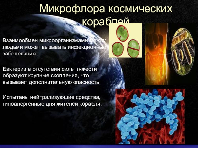 Микрофлора космических кораблейВзаимообмен микроорганизмами между людьми может вызывать инфекционные заболевания. Бактерии в отсутствии силы тяжести образуют крупные