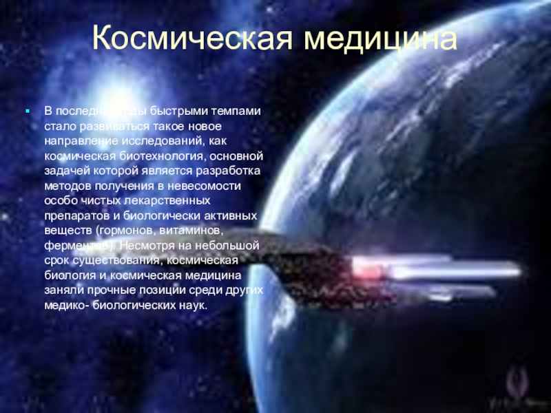 Космическая медицинаВ последние годы быстрыми темпами стало развиваться такое новое направление исследований, как космическая биотехнология, основной задачей
