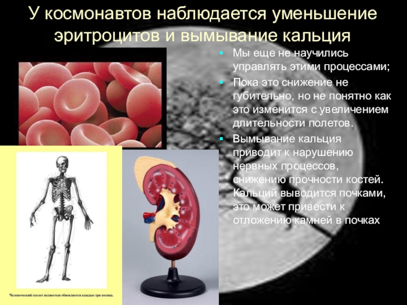 У космонавтов наблюдается уменьшение эритроцитов и вымывание кальция Мы еще не научились управлять этими процессами;Пока это снижение