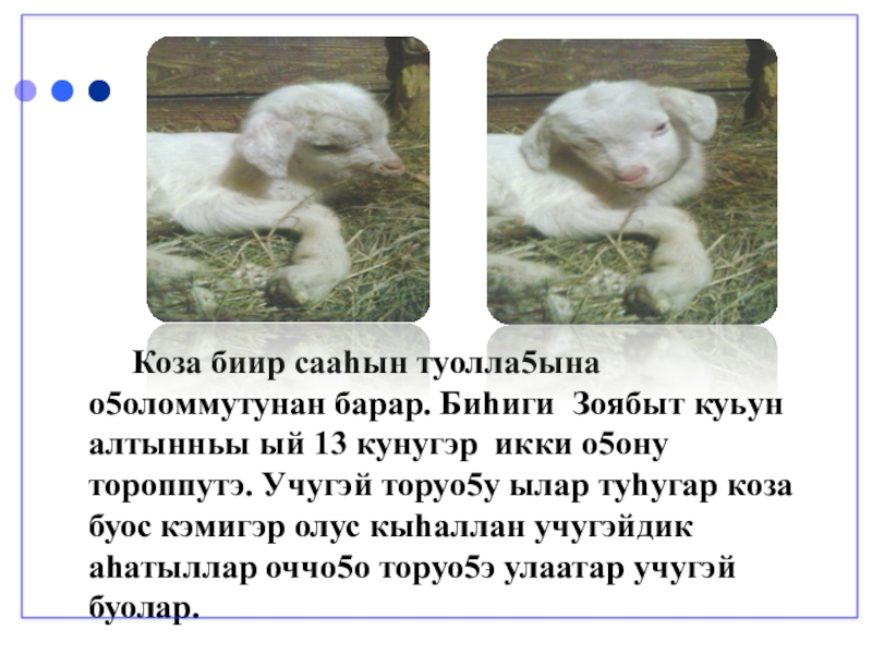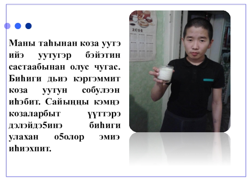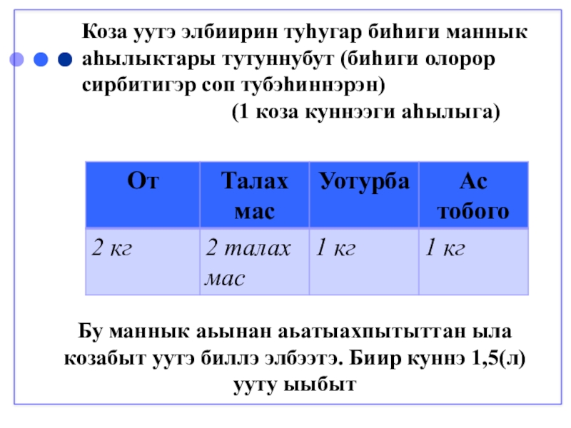 Бу маннык аьынан аьатыахпытыттан ыла козабыт уутэ биллэ элбээтэ. Биир куннэ 1,5(л) ууту ыыбыт