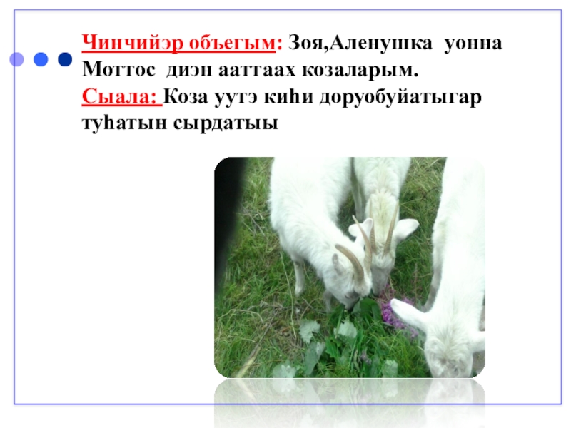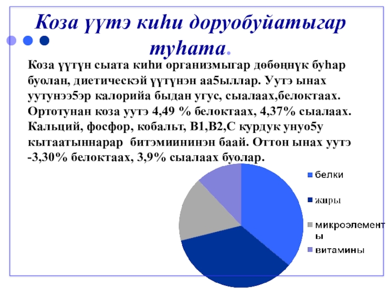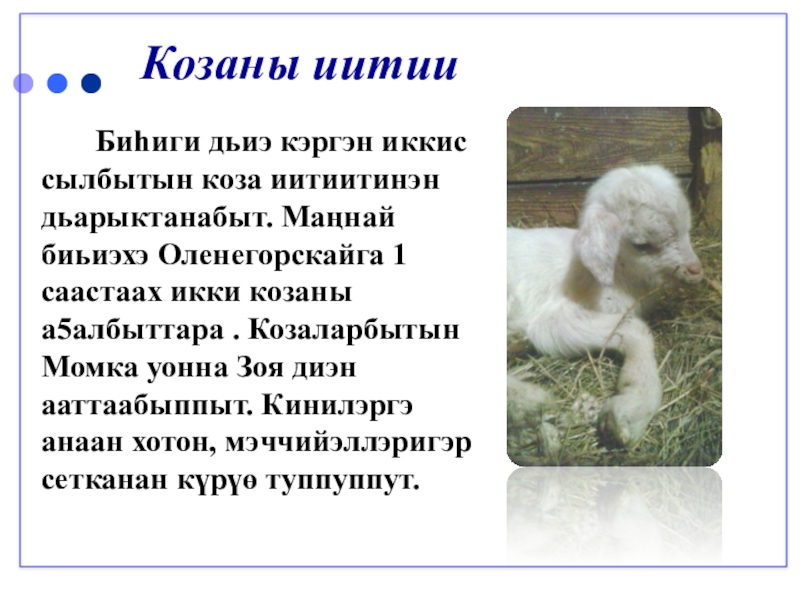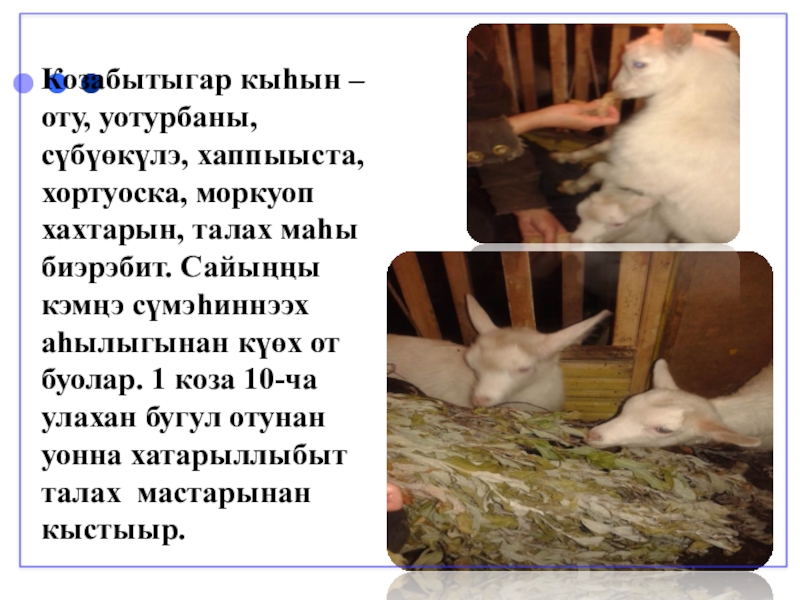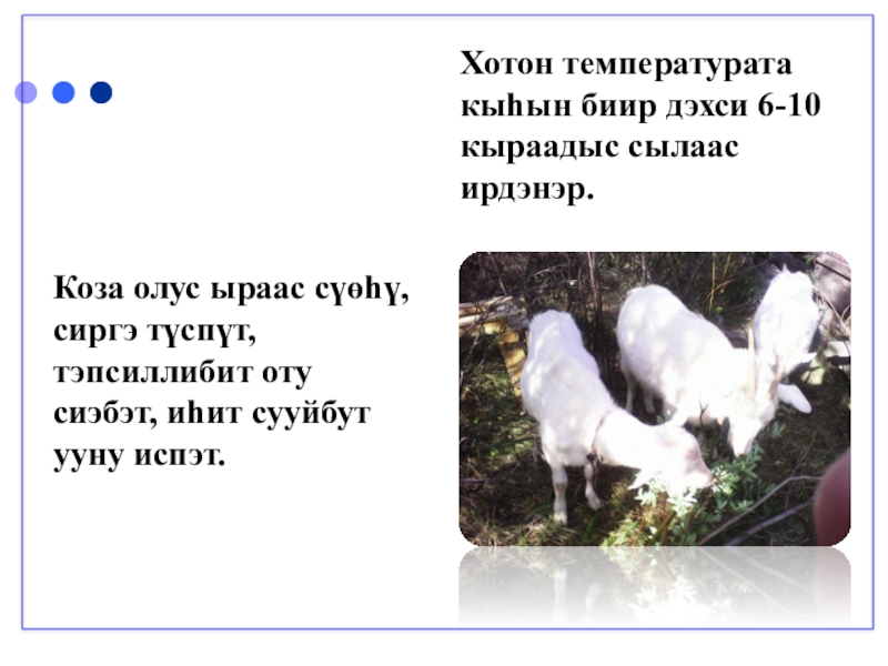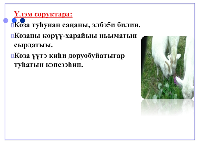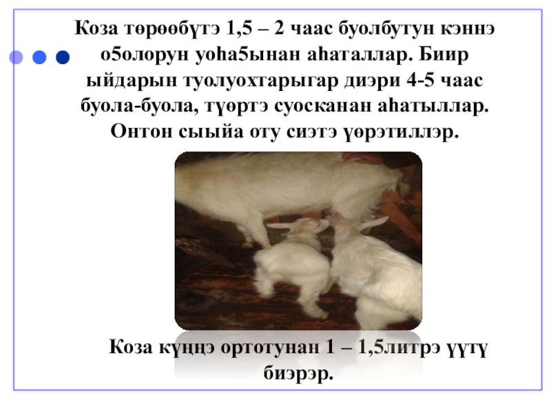 Коза күңңэ ортотунан 1 – 1,5литрэ үүтү биэрэр.