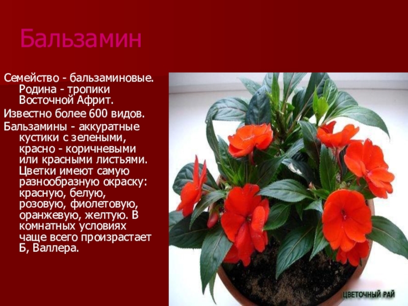 Бальзамины - аккуратные кустики с зелеными, красно - коричневыми или красными листьями. Цветки имеют самую разнообразную окраску: красную, белую, розовую, фиолетовую, оранжевую, желтую. В комнатных условиях чаще всего произрастает Б, Валлера.