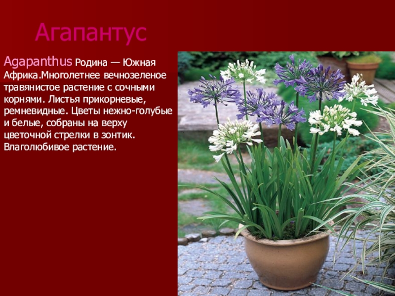 Agapanthus Родина — Южная Африка.Многолетнее вечнозеленое травянистое растение с сочными корнями.