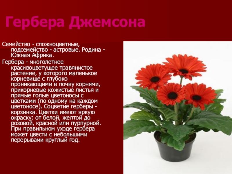 Гербера - многолетнее красивоцветущее травянистое растение, у которого маленькое корневище с глубоко проникающими в почву корнями, прикорневые кожистые листья и прямые голые цветоносы с цветками (по одному на каждом цветоносе). Соцветие герберы - корзинка. Цветки имеют яркую окраску: от белой, желтой до розовой, красной или пурпурной. При правильном уходе гербера может цвести с небольшими перерывами круглый год.