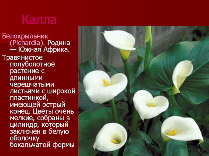 листьями с широкой пластинкой, имеющей острый конец. Цветы очень мелкие, собраны в цилиндр, который заключен в белую оболочку бокальчатой формы