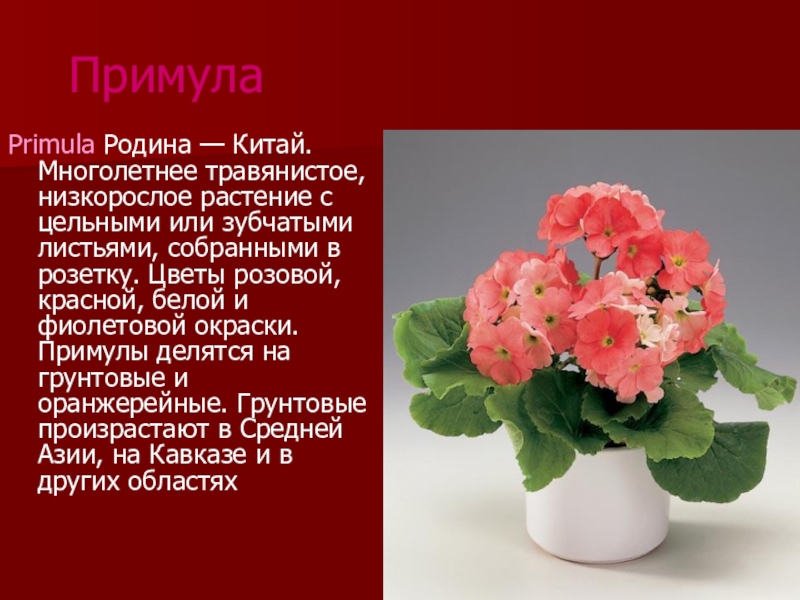 зубчатыми листьями, собранными в розетку. Цветы розовой, красной, белой и фиолетовой окраски. Примулы делятся на грунтовые и оранжерейные. Грунтовые произрастают в Средней Азии, на Кавказе и в других областях