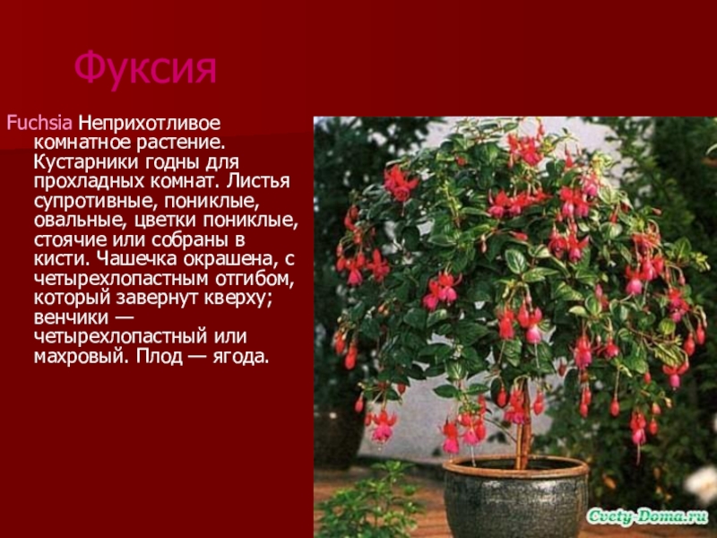 Fuchsia Неприхотливое комнатное растение. Кустарники годны для прохладных комнат. Листья супротивные,