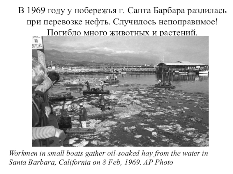Workmen in small boats gather oil-soaked hay from the water in Santa Barbara, California on 8 Feb, 1969. AP Photo