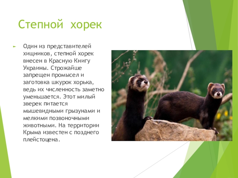 Украины. Строжайше запрещен промысел и заготовка шкурок хорька, ведь их численность заметно уменьшается. Этот милый зверек питается мышевидными грызунами и мелкими позвоночными животными. На территории Крыма известен с позднего плейстоцена.