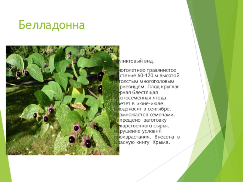 Плод круглая черная блестящая многосеменная ягода. Цветет в июне-июле, плодоносит в сентябре. Размножается семенами. Запрещено заготовку лекарственного сырья, нарушение условий произрастания. Внесена в Красную книгу Крыма.