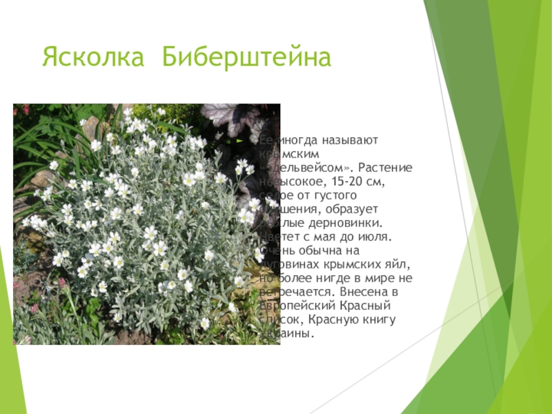 Ее иногда называют крымским «эдельвейсом». Растение невысокое, 15-20 см,
