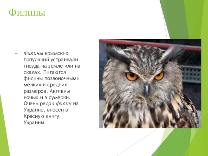 Питаются филины позвоночными мелких и средних размеров. Активны ночью и в сумерки. Очень редок филин на Украине, внесен в Красную книгу Украины.