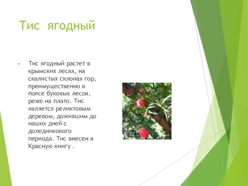 гор, преимущественно в поясе буковых лесов, реже на плато. Тис является реликтовым деревом, дожившим до наших дней с доледникового периода. Тис внесен в Красную книгу .