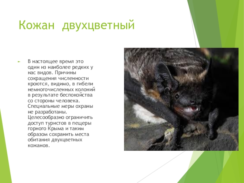 нас видов. Причины сокращения численности кроются, видимо, в гибели немногочисленных колоний в результате беспокойства со стороны человека. Специальные меры охраны не разработаны. Целесообразно ограничить доступ туристов в пещеры горного Крыма и таким образом сохранить места обитания двухцветных кожанов.