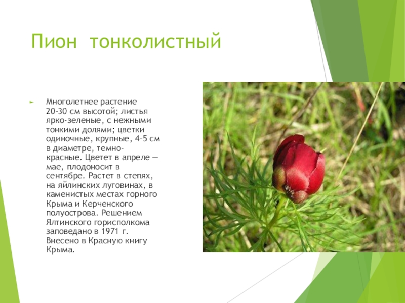 тонкими долями; цветки одиночные, крупные, 4–5 см в диаметре, темно-красные. Цветет в апреле — мае, плодоносит в сентябре. Растет в степях, на яйлинских луговинах, в каменистых местах горного Крыма и Керченского полуострова. Решением Ялтинского горисполкома заповедано в 1971 г. Внесено в Красную книгу Крыма.