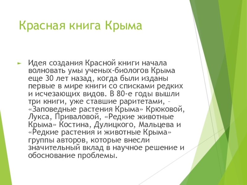 еще 30 лет назад, когда были изданы первые в мире книги со списками редких и исчезающих видов. В 80-е годы вышли три книги, уже ставшие раритетами, – «Заповедные растения Крыма» Крюковой, Лукса, Приваловой, «Редкие животные Крыма» Костина, Дулицкого, Мальцева и «Редкие растения и животные Крыма» группы авторов, которые внесли значительный вклад в научное решение и обоснование проблемы.