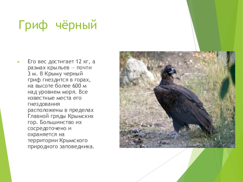 почти 3 м. В Крыму черный гриф гнездится в горах, на высоте более 600 м над уровнем моря. Все известные места его гнездования расположены в пределах Главной гряды Крымских гор. Большинство их сосредоточено и охраняется на территории Крымского природного заповедника.