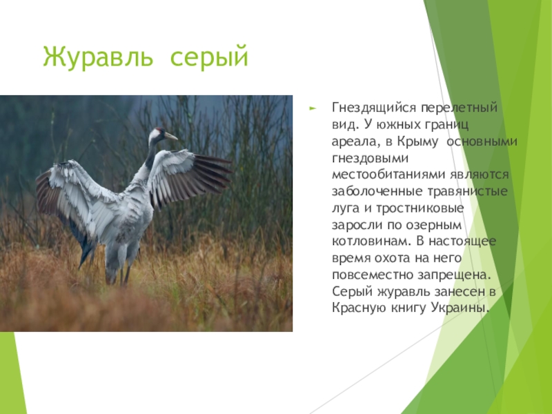основными гнездовыми местообитаниями являются заболоченные травянистые луга и тростниковые заросли по озерным котловинам. В настоящее время охота на него повсеместно запрещена. Серый журавль занесен в Красную книгу Украины.