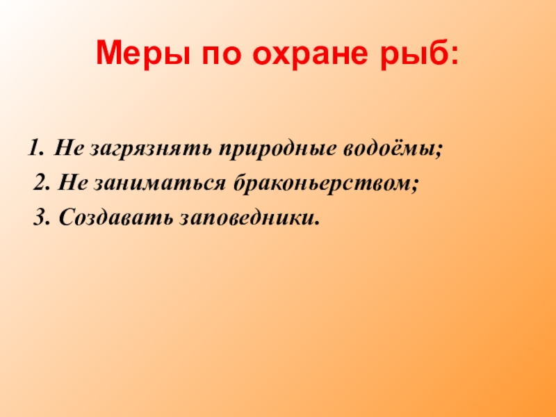 Меры по охране рыб:Не загрязнять природные водоёмы;2. Не заниматься браконьерством;3. Создавать заповедники.