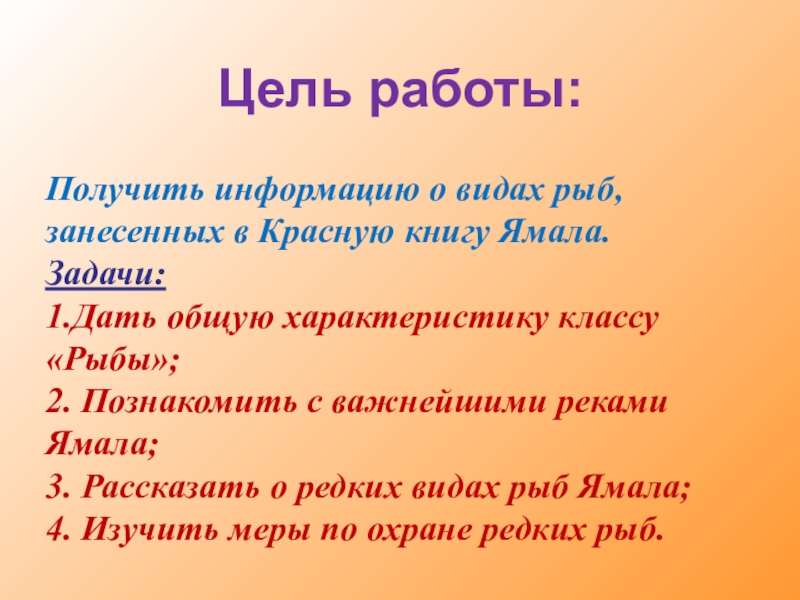 Цель работы:Получить информацию о видах рыб, занесенных в Красную книгу Ямала.Задачи:1.Дать общую характеристику классу «Рыбы»;2. Познакомить с важнейшими реками Ямала;3. Рассказать о редких видах рыб Ямала;4. Изучить меры по охране редких рыб.