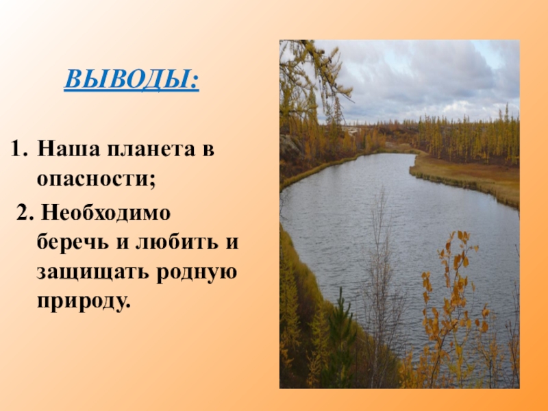 ВЫВОДЫ:Наша планета в опасности;2. Необходимо беречь и любить и защищать родную природу.