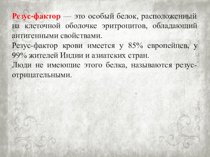 Слайд 14Резус-фактор — это особый белок, расположенный на клеточной оболочке эритроцитов, обладающий