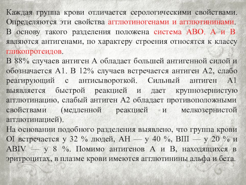 Слайд 11Каждая группа крови отличается серологическими свойствами. Определяются эти свойства агглютиногенами и