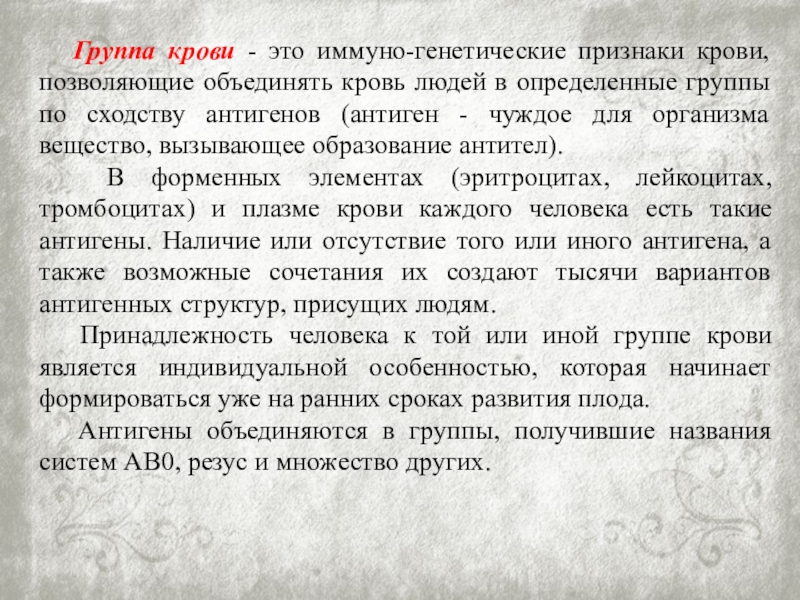 Слайд 13 Группа крови - это иммуно-генетические признаки крови, позволяющие объединять