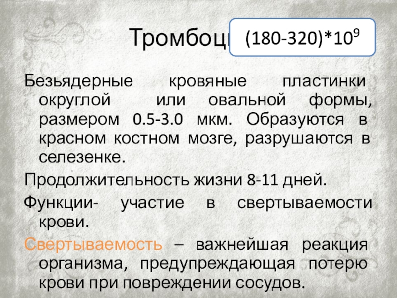 Безьядерные кровяные пластинки округлой или овальной формы, размером 0.5-3.0 мкм. Образуются