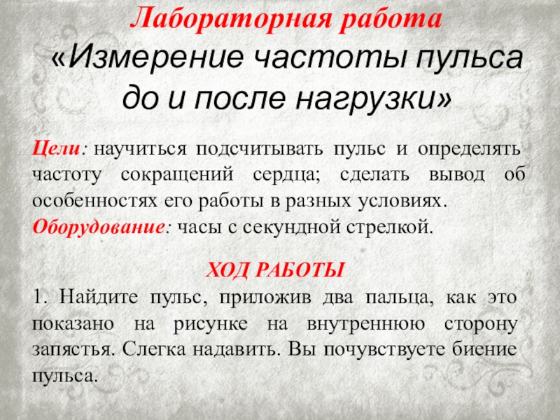 Слайд 45Цели: научиться подсчитывать пульс и определять частоту сокращений сердца; сделать вывод об
