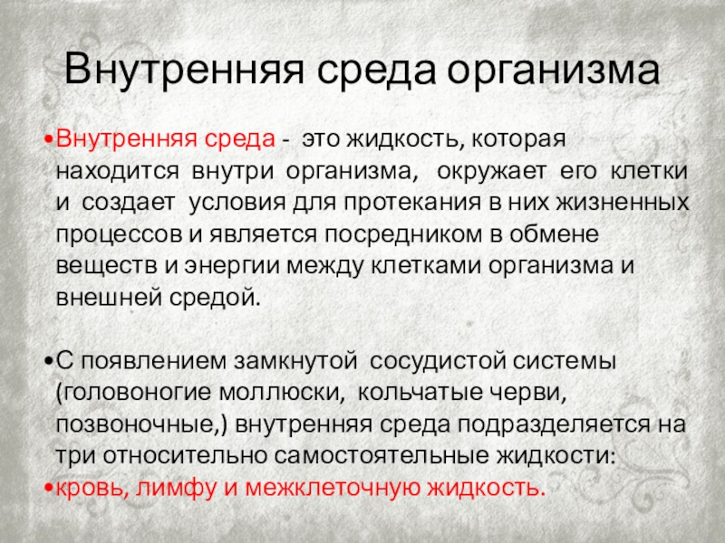 С появлением замкнутой сосудистой системы (головоногие моллюски, кольчатые черви, позвоночные,) внутренняя среда подразделяется на три относительно самостоятельные жидкости: