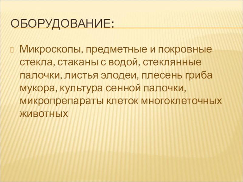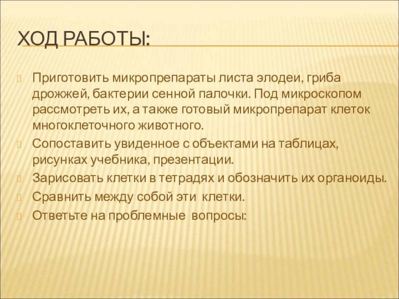 Оборудование: микроскопы, предметные и покровные стекла, лист элодеи, разведенные дрожжи, культура сенной палочки, микропрепа