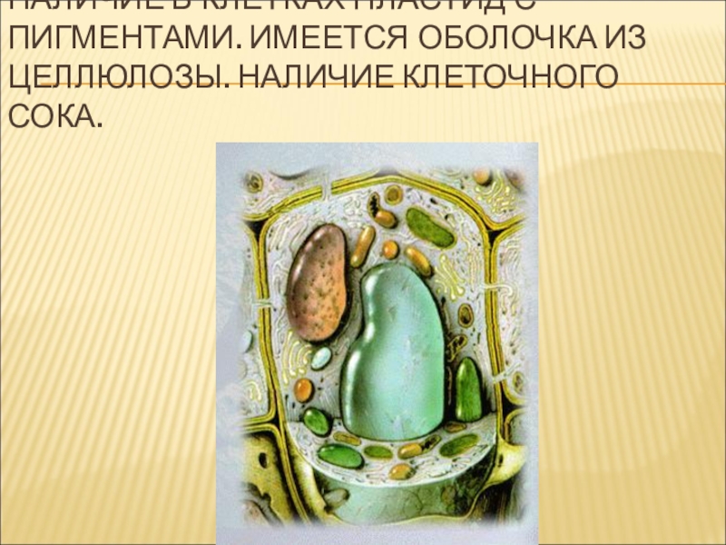 Слайд 7НАЛИЧИЕ В КЛЕТКАХ ПЛАСТИД С ПИГМЕНТАМИ. ИМЕЕТСЯ ОБОЛОЧКА ИЗ ЦЕЛЛЮЛОЗЫ. НАЛИЧИЕ
