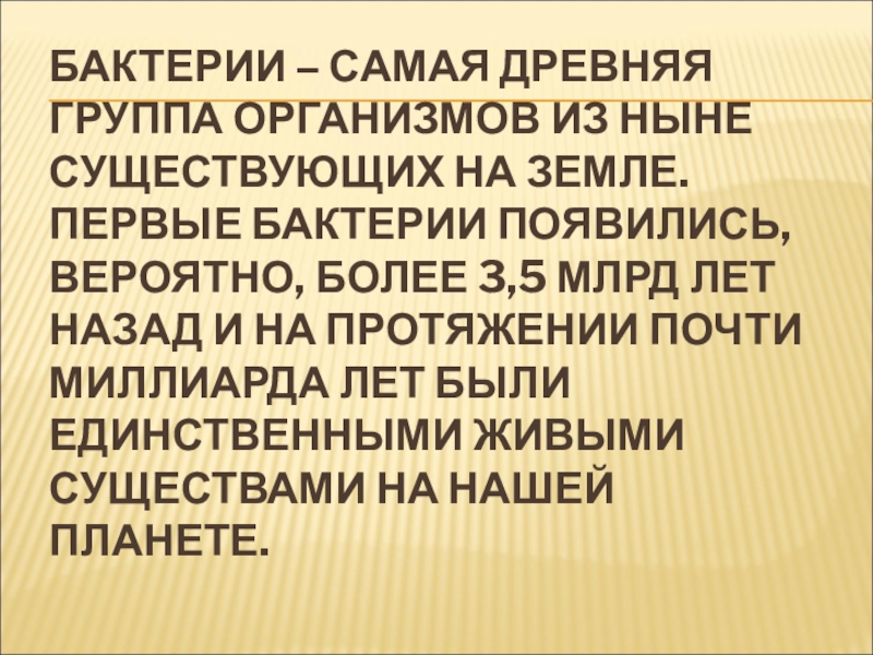 Слайд 26БАКТЕРИИ – САМАЯ ДРЕВНЯЯ ГРУППА ОРГАНИЗМОВ ИЗ НЫНЕ СУЩЕСТВУЮЩИХ НА ЗЕМЛЕ.
