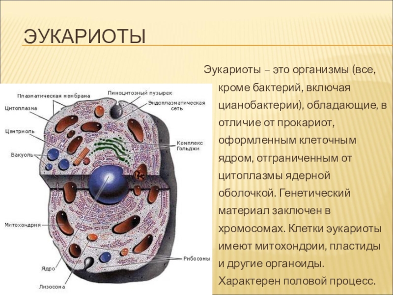 отличие от прокариот, оформленным клеточным ядром, отграниченным от цитоплазмы ядерной оболочкой. Генетический материал заключен в хромосомах. Клетки эукариоты имеют митохондрии, пластиды и другие органоиды. Характерен половой процесс.
