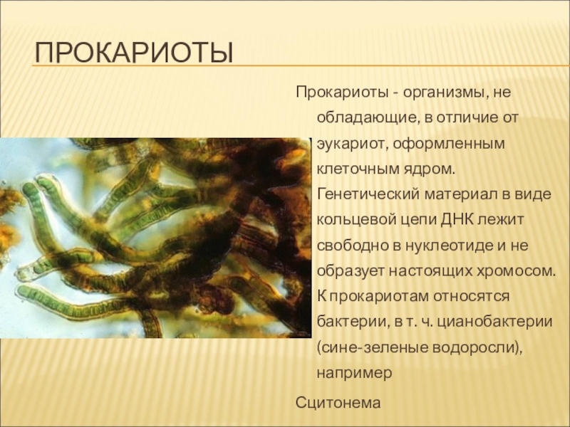 ядром. Генетический материал в виде кольцевой цепи ДНК лежит свободно в нуклеотиде и не образует настоящих хромосом. К прокариотам относятся бактерии, в т. ч. цианобактерии (сине-зеленые водоросли), например