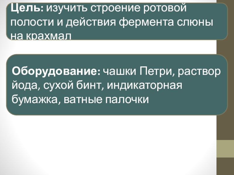 Цель: изучить строение ротовой полости и действия фермента слюны на крахмалОборудование: чашки Петри, раствор йода, сухой бинт, индикаторная бумажка, ватные палочки