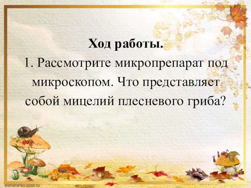 Слайд 4Ход работы. 1. Рассмотрите микропрепарат под микроскопом. Что представляет собой мицелий плесневого