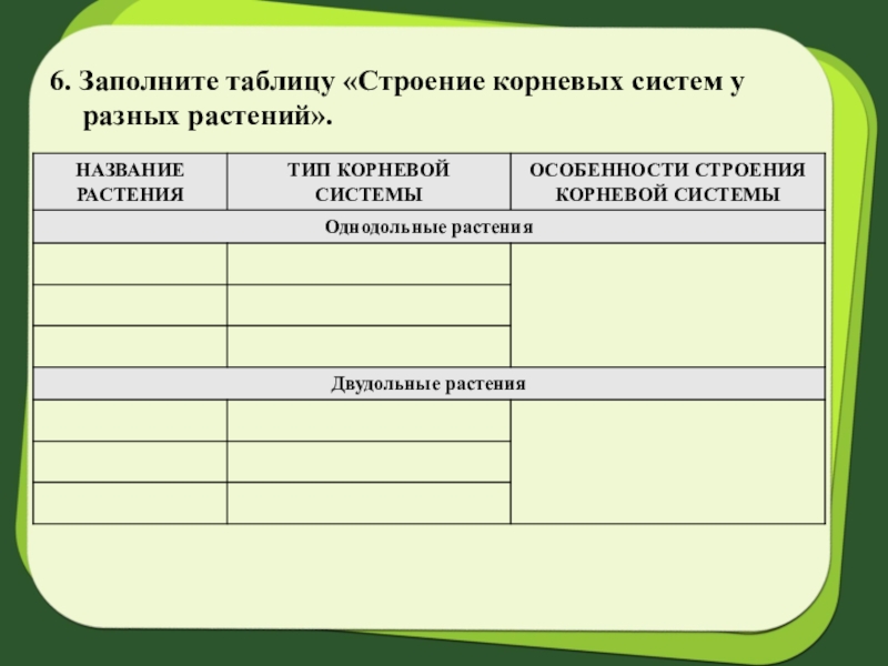 6. Заполните таблицу «Строение корневых систем у разных растений».