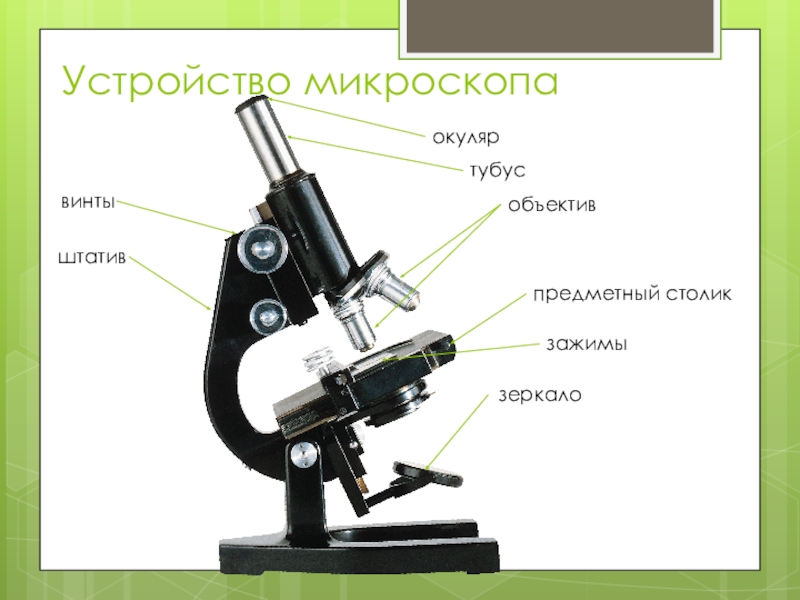 Микроскоп. Изучите микроскоп. Найдите тубус, окуляр, объектив, штатив с предметным столиком, зеркало, винты.