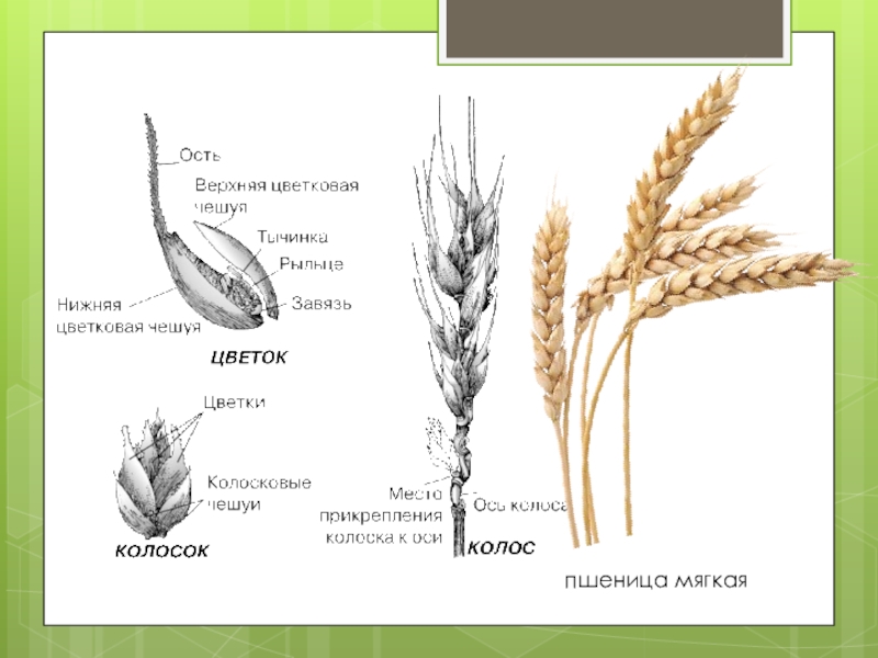2. Ознакомиться со строением представителя класса Однодольные – пшеницы. Определить основные элементы её строения. Изучить строение побега пшеницы, листьев, соцветия, одиночного цветка, плода. Зарисовать в тетрадь, подписать все части и органы.